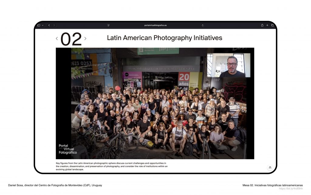 El diálogo centrado en Latinoamérica pone el foco en la relación entre fotografía, memoria y esfera pública. Daniel Sosa presenta la experiencia del Centro de Fotografía de Montevideo como modelo de institución pública dedicada a la producción y conservación de imágenes. Thyago Nogueira expone la línea de trabajo del Instituto Moreira Salles, donde la fotografía dialoga con otras prácticas del arte contemporáneo. Soledad Abarca incorpora la perspectiva patrimonial desde la Biblioteca Nacional de Chile, subrayando la relevancia de los archivos fotográficos en la construcción del conocimiento.