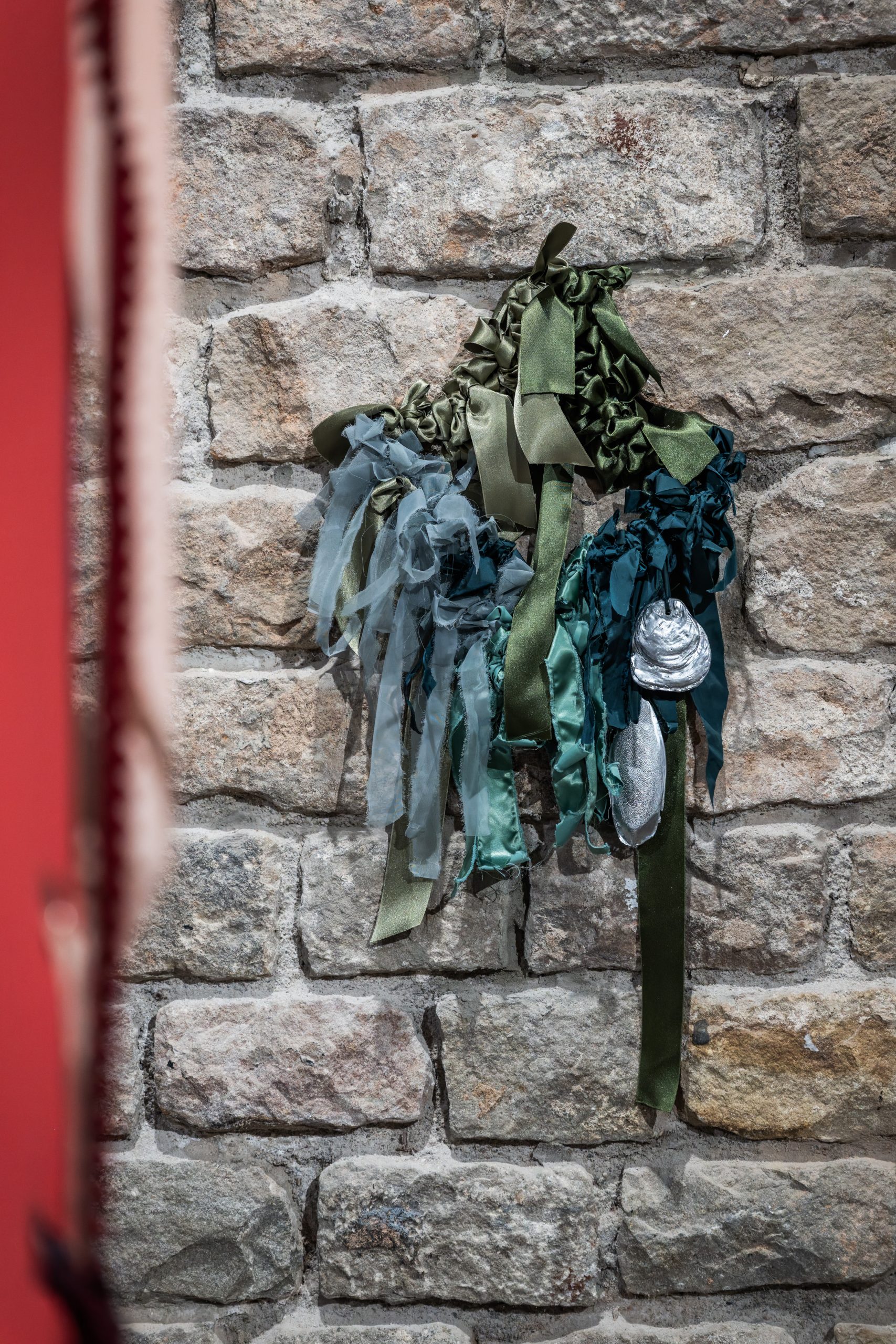 Detalle de los tejidos empleados en la exposición ‘La romería de los cornudos’ en La Capella (29 de abril – 6 de julio de 2025), Barcelona. Cortesía de la artista y La Capella.