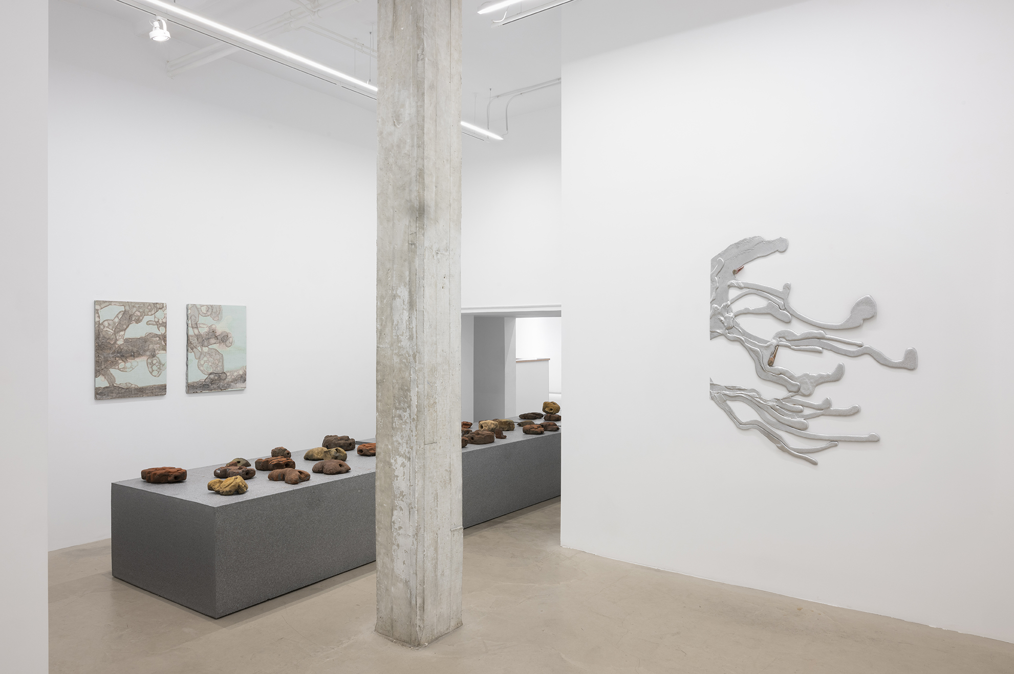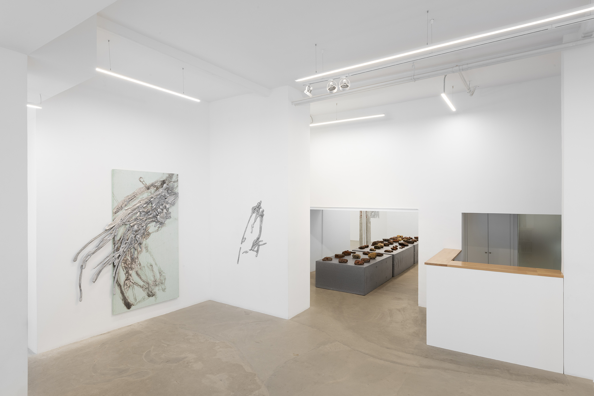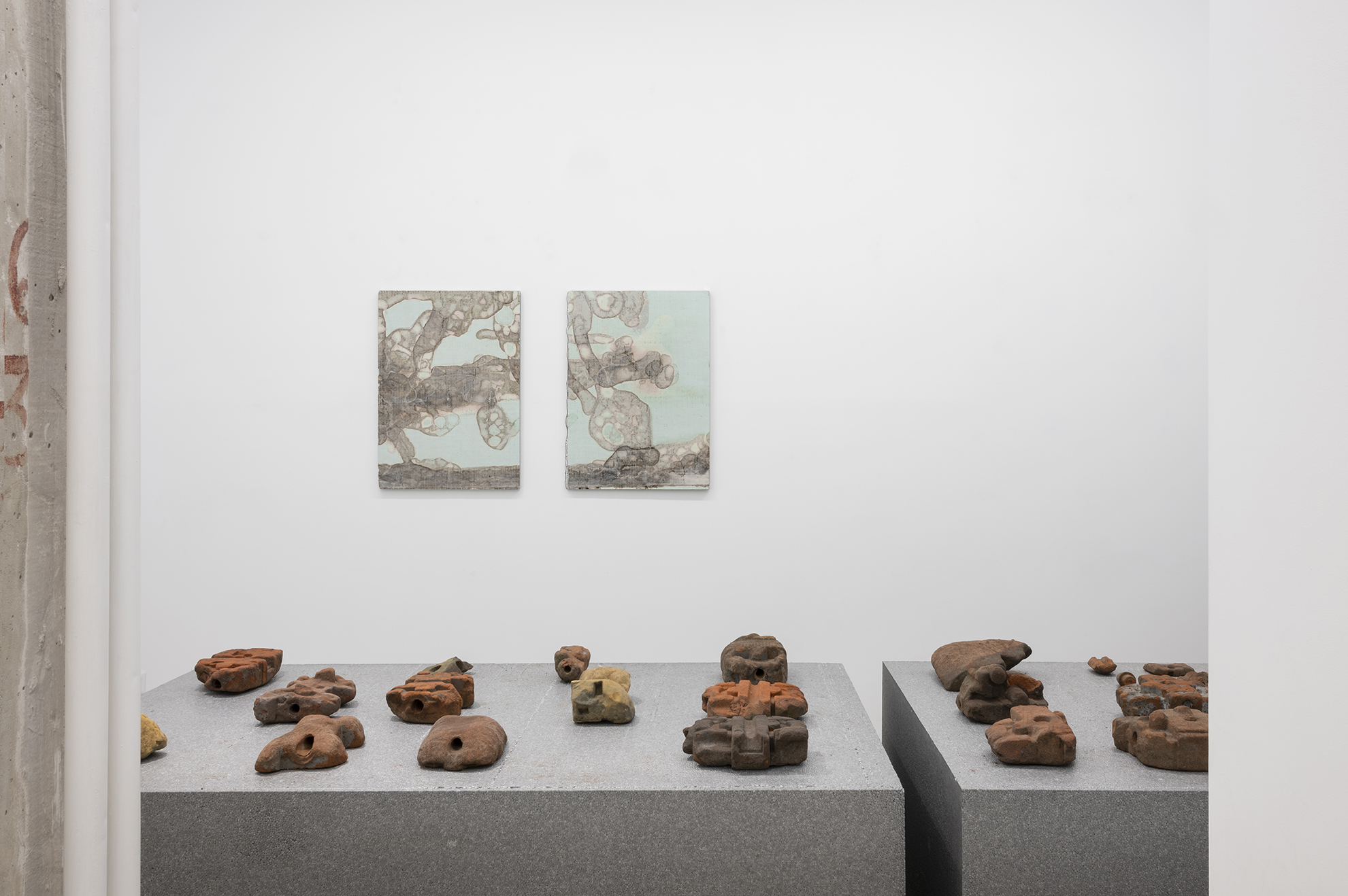 Al entrar en la sala, encontramos la serie “nothing/nobody”, un conjunto de moldes de arena usados en el ámbito industrial para producir bloques de motor en la década de los 80 y 90 del siglo XX. Hoy, ya fosilizados, se perciben como piezas de arqueología corporativa, extraídas del ciclo productivo para regresar al entorno natural, y que, acumuladas, dan lugar a nuevas orografías en forma de colinas y pinares en su Navarra natal. Irijalba rescata estos residuos que en su momento fueron un secreto industrial y ahora, ya desgastados por la lluvia y el viento, nos trasladan a un contexto cultural donde aparecen reminiscencias de la Oaxaca precolombina, la escultura moderna de fin de siglo o el atrezzo de una película de Indiana Jones, pero es nuestra retina, colapsada por tanta imagen, la que recompone estas referencias.