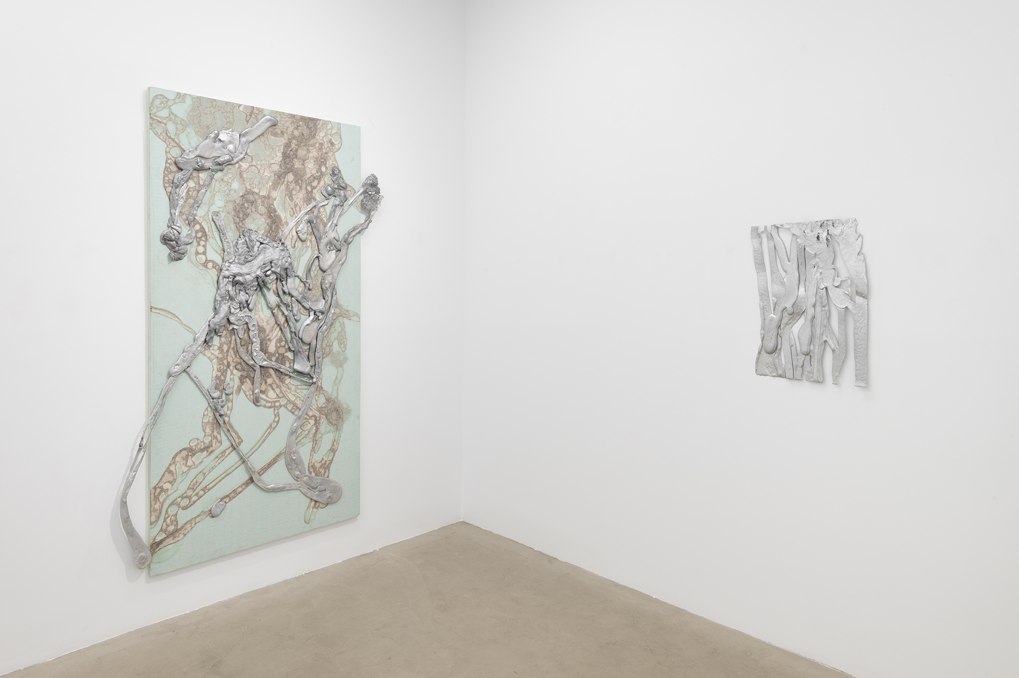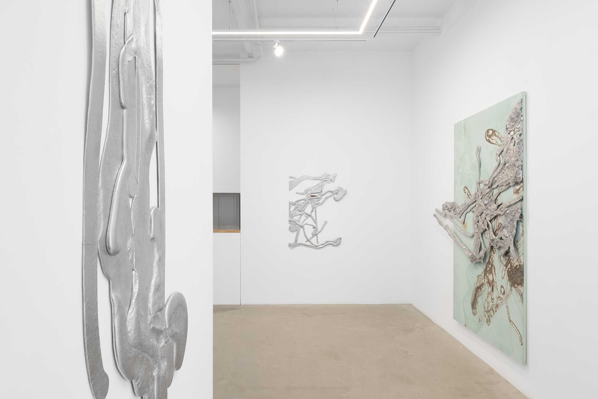 De forma casi antagónica, en la exposición se muestra la serie “Ghost’s shadow”, compuesta una serie de aluminios fluidos, llamados, en el argot industrial, blandos o dulces. En los últimos años, Irijalba ha intentado que el metal se exprese libremente generando un ciclo de fundido y vertido en busca de consenso entre la expresión material y el deseo del artista. A la observación atenta de este fluir no escapa la seducción del residuo, siempre presente en la obra del artista, que utiliza en algunas piezas de esta serie únicamente las impresiones del metal fundido sobre el material ignífugo y espuma metálica.