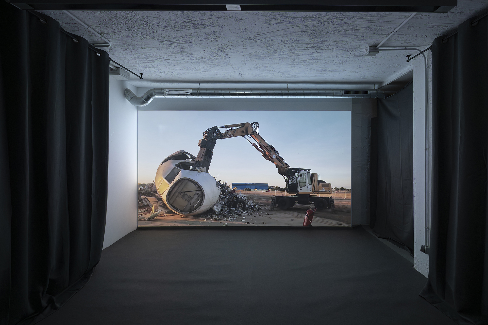 La película que podemos ver en la planta inferior da nombre a la exposición y resume todas las inquietudes recientes del artista. En su centro, la relación entre la aerodinámica y la mecánica de los cuerpos, que cobra aquí un alcance político de escala universal. Es sabido que las aves se orientan sirviéndose del magnetismo terrestre, y que lo que conocemos como migración precede al concepto humano de frontera. La falta de conexión del ser humano con las corrientes naturales se traslada en este film a las formas, un tanto patéticas y siempre sucedáneas, en que los humanos se acercan al sueño de volar, con réplicas de aeronaves pesadas, pilotadas aquí por jubilados de prominente barriga y, en su reverso, halcones cosificados ajenos a su condición de nuevos turistas.
