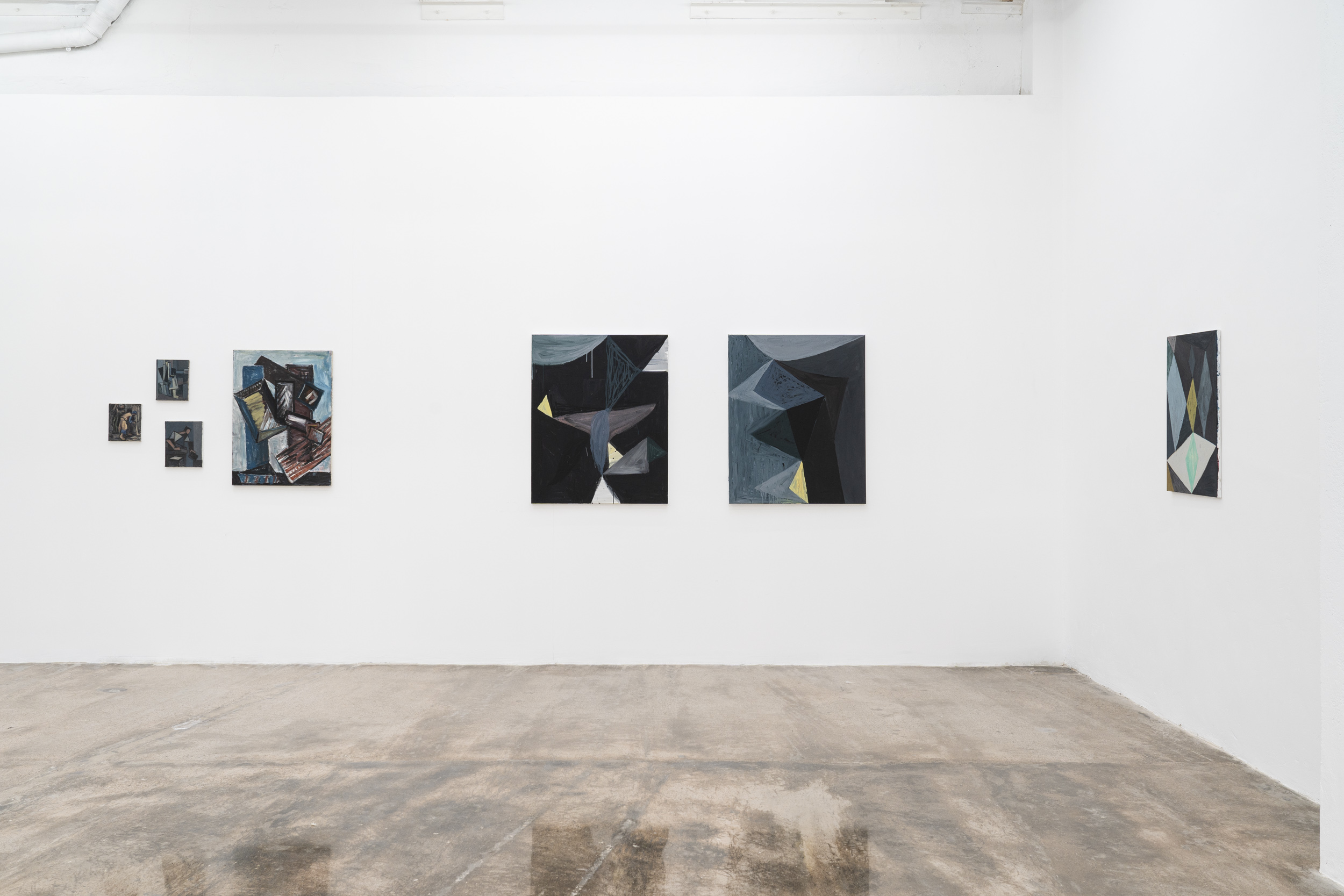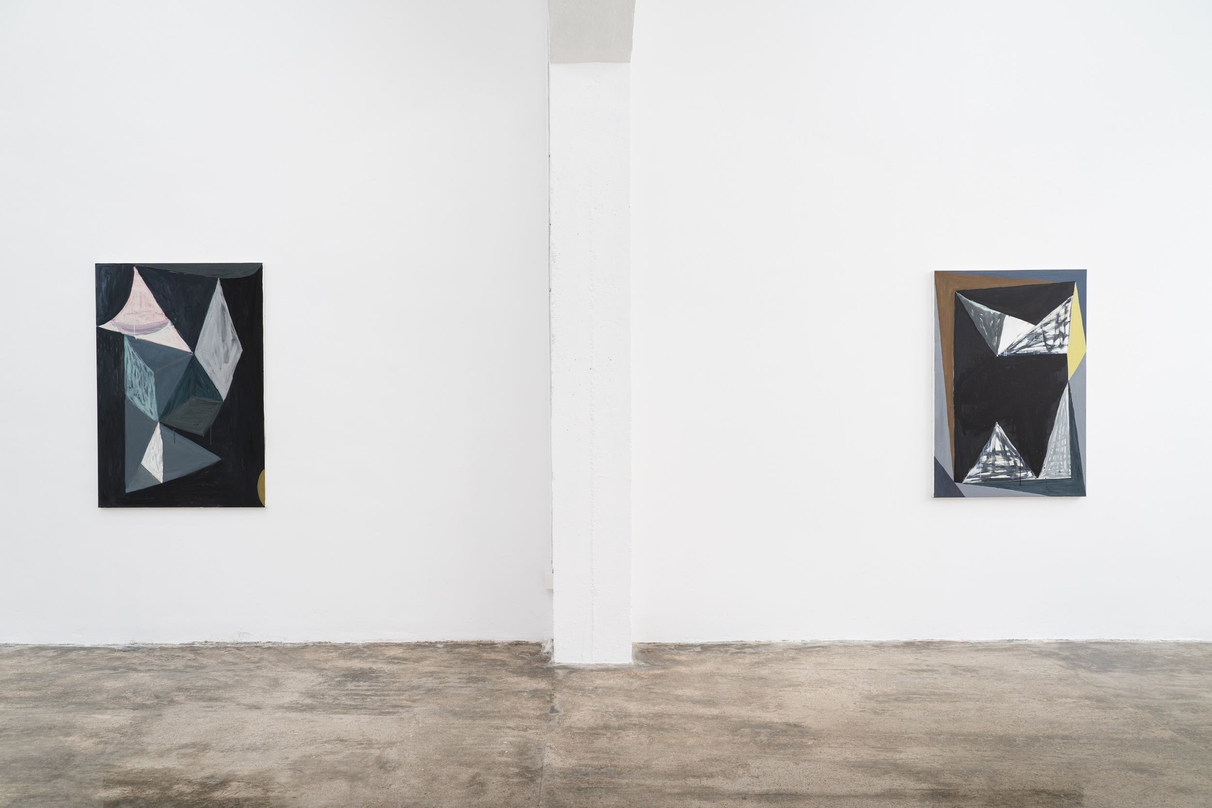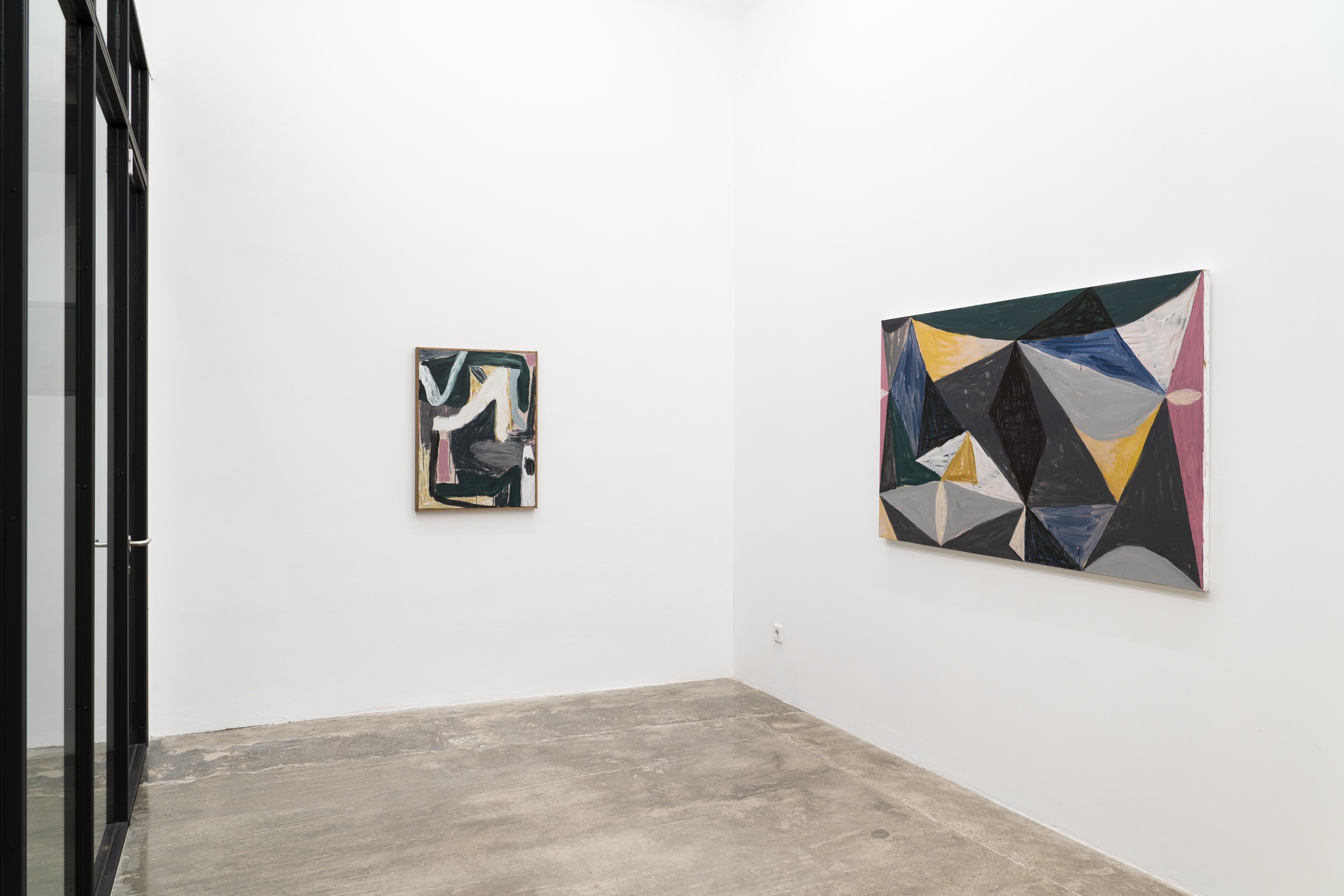 En Et Fuga se pueden ver cuatro obras de pequeño formato que la familia de Miguel Ángel Campano amablemente ha cedido a la galería. Dichas obras pertenecen a ese momento en el que Campano estudiaba de forma más intensa la obra de Poussin y en las que se puede apreciar esa metodología de trabajo antes mencionada que le llevó a la reducción de la forma -en este caso centrándose en el motivo de Ruth y Booz. Por su parte, vemos como a lo largo de su obra Eduardo Martín del Pozo se esfuerza también por agotar las posibilidades plásticas de ciertos motivos; si en el pasado fueron plantas o bodegones (al igual que hicieron tantos otros artistas como Ellsworth Kelly o Giorgio Morandi respectivamente), vemos como la obra reciente Del Pozo muestra especial interés por la composición, y más concretamente por la idea del plano. De esta manera, no es tanto una figura o motivo concreto lo que se pretende explorar si no más bien el encaje de formas y valores cromáticos. Mientras que la serie Praeludium es un tipo de pintura de aspecto plano y ordenado, ahora nos encontramos con una verdadera pulsión en la que los planos y las formas se entrelazan unos a otros generando dinámicas y ritmos muy productivos que recorren toda la superficie del lienzo. Esta relación activa y afectiva entre dichos elementos formales nos lleva a otro componente característico en la obra de Eduardo como es la noción del tiempo en sus varias acepciones —el tiempo que recorre las genealogías históricas de las que uno forma parte y el tiempo (performático) que se requiere para realizar una obra. También se refiere al tiempo embebido en la propia pintura, que al igual que la música, resulta de la combinación sus componentes, y por supuesto el tiempo que dedica el espectador a leer los lienzos.