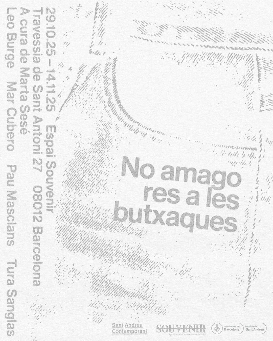 El miércoles 29 de octubre a las 19h Sant Andreu Contemporani inaugura en Espai Souvenir No amago res a les butxaques, una exposición comisariada por Marta Sesé con la participación de Leo Burge, Mar Cubero, Pau Masclans y Tura Sanglas.