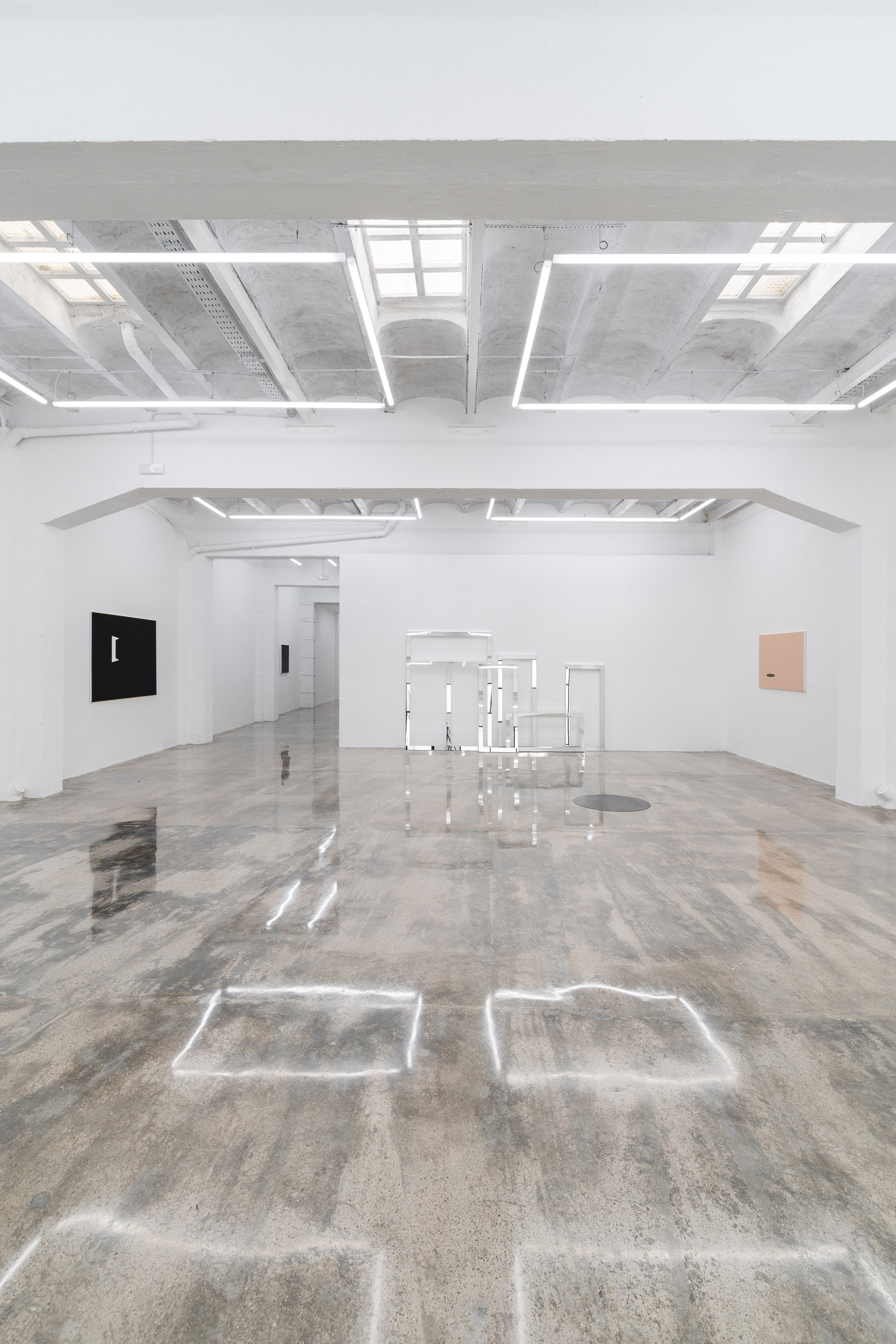 Estructuras de vidrio nos aguardan silenciosamente. Cuadros palpitan al son de sus cromatismos. Intrigantes círculos negros quedan a la espera.