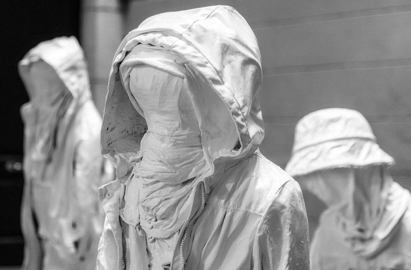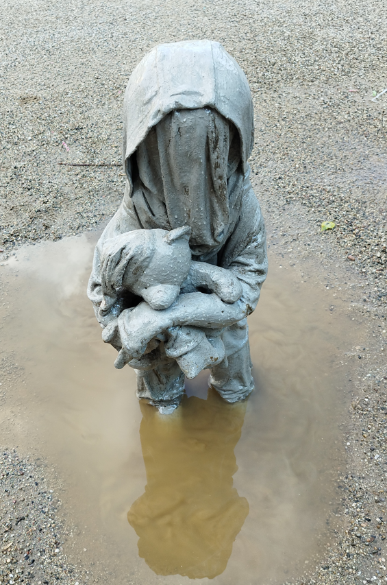 Las esculturas, realizadas con ropa real aportada por madres y padres migrantes y pintadas de blanco, representan a los infantes que han perdido su origen y su niñez. La ropa, a veces, es la única cosa que pudieron llevarse y, por esta razón, se transforma en ejemplo de resiliencia y resignificación, llevándose consigo recuerdos, narrativas y afectos. El color blanco, por otra banda, simboliza la pureza y la inocencia de los niños, capaces de sobrevivir y adaptarse a las adversidades del exilio. El rostro de las estatuas que está solo desdibujado no pretende representar una identidad específica o una persona concreta, sino mostrar una situación colectiva y universal donde cada cual puede identificarse.