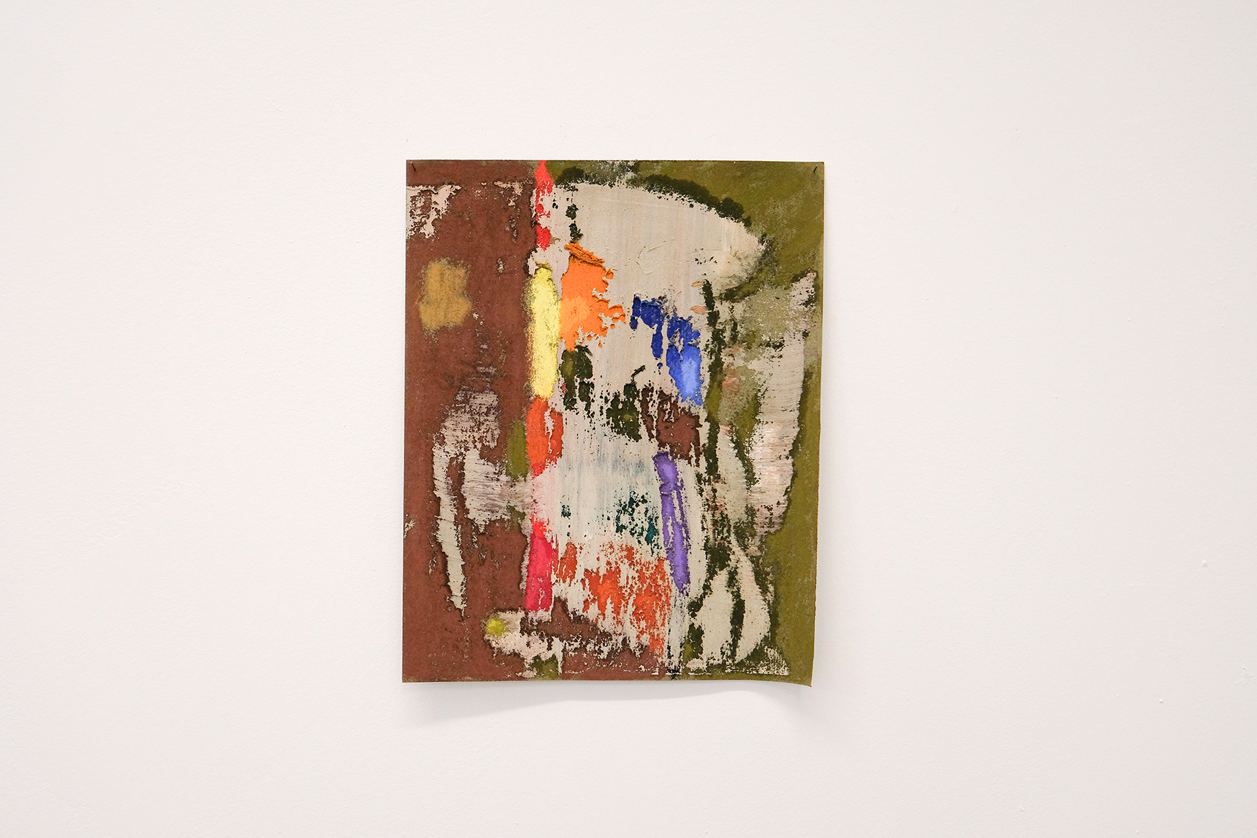 «En los papeles de dibujo, recojo el gesto de descarte. En los papeles se recoge ese resto que no quiere acabar deshechado, que todavía contiene la energía (la paleta de color) de los primeros gestos compositivos. Un fin que remite a un inicio. El interés por mantener el color vívido me lleva al papel de lija, en su poética de la fricción, el pastel se erosiona suspendido en su superficie, y se sujeta con el abrazo de la pintura al óleo, que también resbala, de algún modo, generando pequeños respiraderos».
