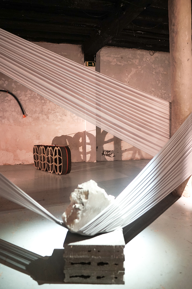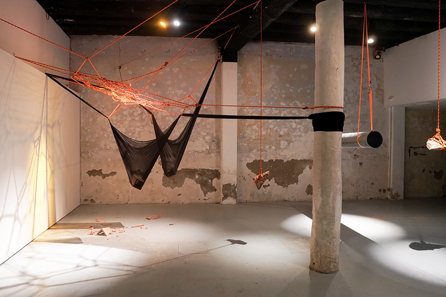 Una instalación colectiva que nació a través de una experimentación colectiva entre un grupo de artistas-amigxs habitando la galería un fin de semana. Una residencia y fusión de diferentes disciplinas, investigaciones y experiencias. Una obra sobre los vínculos, la interdependencia y las tensiones.