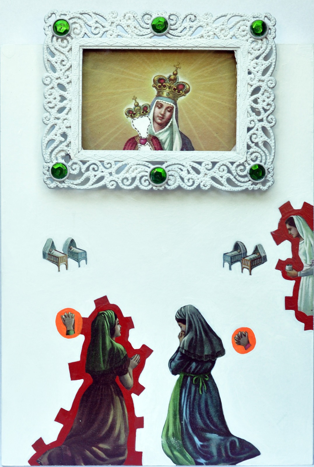 Torres construye pinturas y objetos a partir de apropiación, intervención y ensamblaje. En gran parte de las obras, fragmentos de memoria dialogan con imágenes que transitan entre el universo cristiano a la herencia religiosa afrobrasileña.