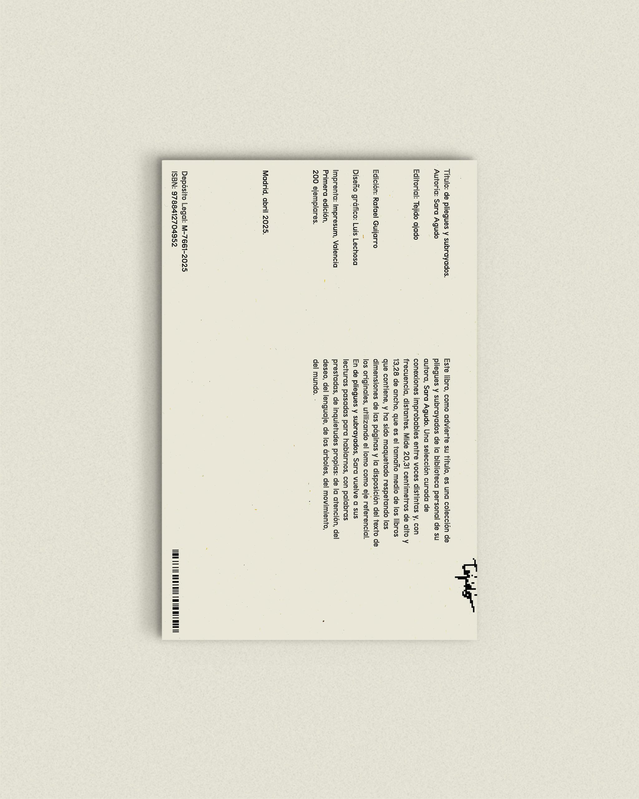 La plataforma editorial Tejido ajado presenta de pliegues y subrayados, un libro de Sara Agudo que recoge pliegues y subrayados de su biblioteca personal, convirtiéndolos en mensajes atemporales y azarosos que tejen su voz propia. Con un tono íntimo y reflexivo, la artista explora la atención, el deseo, el lenguaje y la naturaleza, preguntándose qué buscaba recordar al subrayar esas frases y qué significado adquieren en el reencuentro.