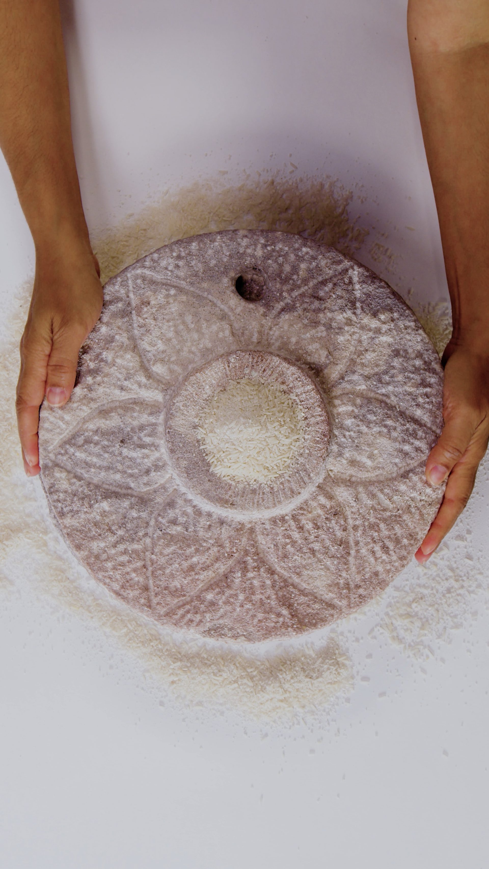 Emergiendo en la intersección de una formación de batalla mitológica y una memoria sonora, la obra vincula la coreografía del Chakravyuh del épico Mahabharata con el trabajo rotatorio de una piedra de moler doméstica. La rotación funciona tanto como estructura como metáfora, una disciplina que organiza cuerpos al servicio mientras afloja los límites de la agencia. La instalación privilegia la escucha como modo de conocimiento: sonido, texto e imagen en movimiento actúan como materiales co-iguales, atrayendo a los espectadores a un campo perceptual donde la meditación y la disonancia coexisten.