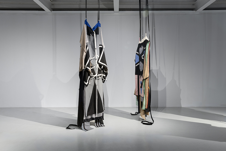 La posibilidad de plegar y desplegar estas piezas textiles introduce además una dimensión nómada. “Boneless” puede transportarse en una maleta y reconfigurarse en cada contexto expositivo, como un teatro ambulante que se activa y transforma según el lugar. Este gesto refuerza la idea de obra como organismo vivo, mutable y dependiente de su entorno.