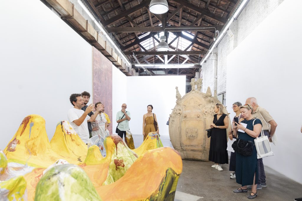 Sortais (Saint-Denis, 1983) desarrolla una reflexión escultórica sobre vacío, presencia y memoria. Tras una juventud inmerso en la escena underground del graffiti y estudios en la Escuela de Bellas Artes de Rouen y la Escuela Nacional Superior de Bellas Artes de París, su obra combina referencias clásicas con la ficción cinematográfica contemporánea. Sus piezas hinchables en látex funcionan como negativos de objetos originales, creando un espacio ambiguo entre forma y sombra. La exposición sugiere presencias fantasmáticas: en la visita guiada, me entero que se trata de la recreación con colores flúor de una mesa donde se celebró una comida, por un lado, y de un mausoleo que parece emergido de la tierra, por el otro.