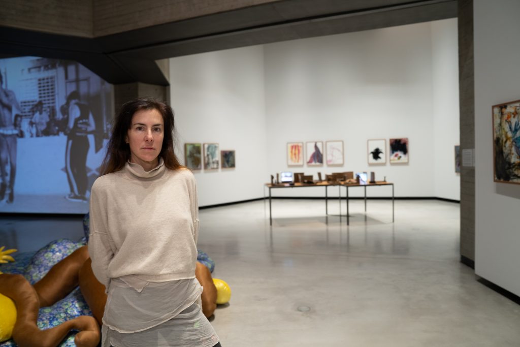 Uno de los núcleos más significativos de la exposición reside en la colaboración activa con artesanxs, artistas y estudiantes de Córdoba. Las piezas cerámicas, producidas junto a María del Carmen Solís y Manuel Luna, traducen la energía del gesto en materia, mientras que los textiles creados con Paloma Povedano evocan la respiración del paisaje andaluz, intensificando la dimensión casi orgánica de la instalación. La película Retorno a BogWalk introduce un contrapunto narrativo en el que el dancehall se presenta como archivo vivo, atravesado por experiencias de migración y arraigo. La inauguración incluye además una activación performativa a cargo de la propia artista, que subraya la interdependencia entre obra, cuerpo y espacio.