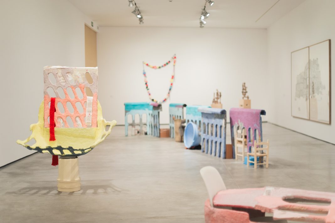 Entre las piezas exhibidas destaca Line II (Laundry Baskets) (2025), una instalación inédita creada para Es Baluard que integra objetos de la artesanía mallorquina como sillas, ollas y platos. La obra plantea el interior de la escultura como un espacio habitable y ofrece una reflexión sobre lo oculto y lo doméstico. Junto a ella, los grandes dibujos vinculados a los talayotes prehistóricos de Menorca y Mallorca expanden la investigación iniciada en proyectos anteriores de Partegàs, transformando elementos cotidianos en muros perforados que remiten al tiempo arqueológico y al origen.