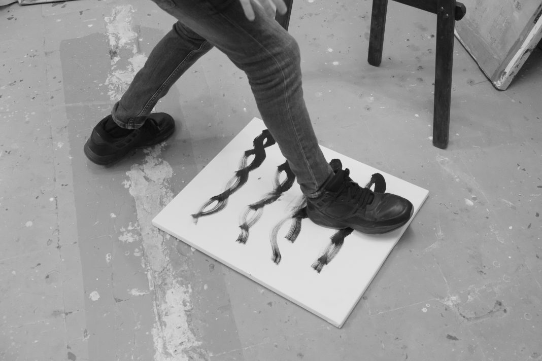 El punto de partida del proyecto es deliberadamente ambiguo. Oscar Abril aparece como figura central de la muestra, con una producción performativa documentada mediante fotografías y materiales de archivo, pero pronto se revela como un personaje de ficción. Detrás de este desdoblamiento se sitúa Óscar Abril Ascaso (Barcelona, 1966), autor de la novela inédita Art d’Acció, que funciona como matriz conceptual de toda la exposición. La muestra no adapta el texto literario, sino que lo expande en el espacio expositivo, convirtiendo la narración en un conjunto de acciones, imágenes y dispositivos de lectura.
