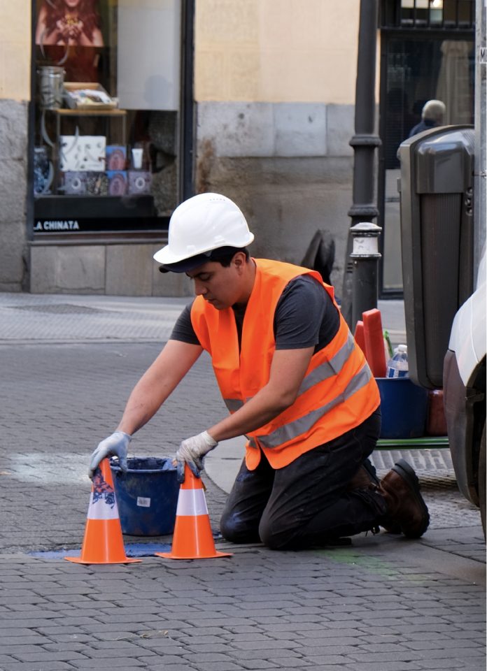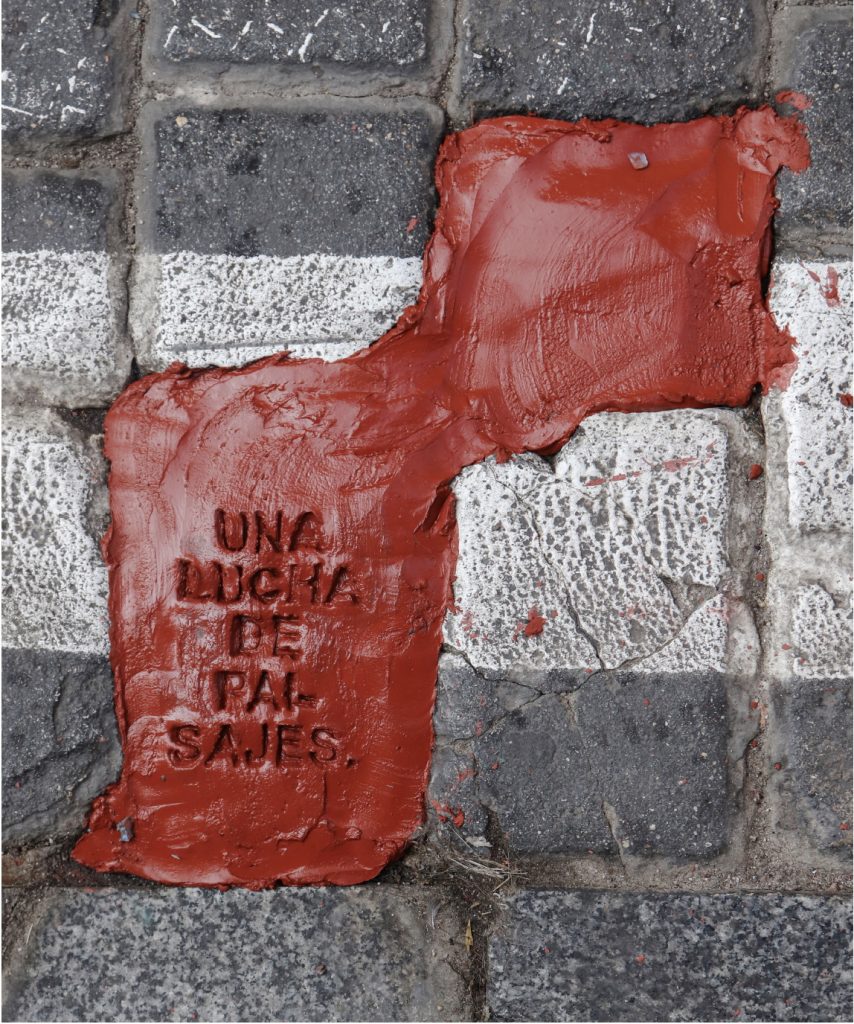 El eje de la muestra es una nueva videoinstalación que documenta acciones realizadas en las proximidades de la galería. Argote interviene las grietas del pavimento con cemento pigmentado–un gesto mínimo, casi doméstico–sobre el que inscribe consignas como «Dignidad y respeto» o «Sentir tu peso». La operación, registrada en vídeo, transforma un acto de mantenimiento urbano en un ejercicio poético de reparación social. El artista desplaza la lógica monumental hacia una escala íntima, insertando en la ciudad micro-monumentos que interpelan al transeúnte desde la sutileza y la cercanía.