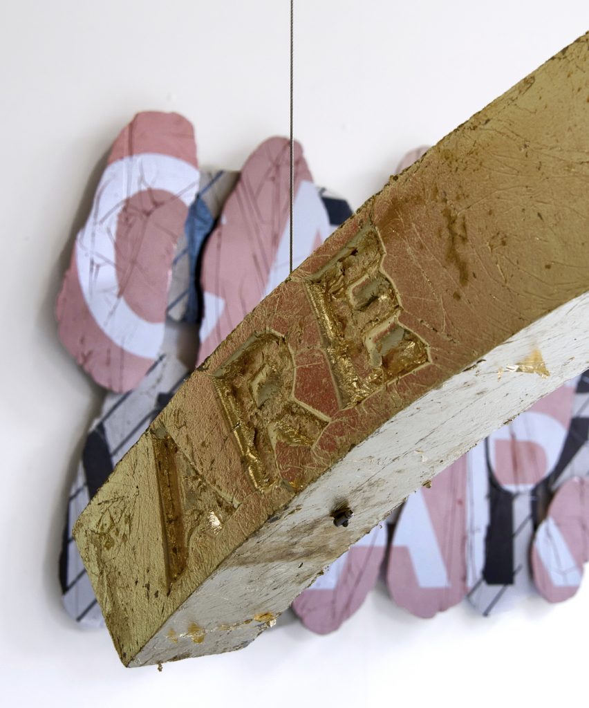 La videoinstalación se articula con piezas que expanden esta reflexión sobre el lenguaje como materia política. Las obras de la serie Concrete Bars cuelgan en el espacio con una tensión formal que contrasta con la fragilidad de las palabras grabadas en el hormigón. Sus frases–afirmaciones que desestabilizan estructuras de autoridad asumidas como naturales–invitan a reconsiderar cómo los discursos producen formas de convivencia y conflicto.