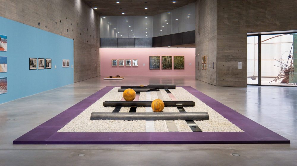 Kiwanga, reciente ganadora del prestigioso Premi de la Fundació Joan Miró 2025, presenta en Córdoba un proyecto que evidencia su interés por los cruces entre historia, cosmología y narrativa. La obra combina materiales diversos–madera coloreada, grava veteada, vidrio espejado, cerámica, arenisca gris Kandla, mármol, tubos de acero y tres esferas de madera de higuera–dispuestos con una precisión que genera tensiones simbólicas entre los mundos material y espiritual. La artista se inspira en los mitos de creación de la cultura Kongo, trasladando esas referencias a un lenguaje contemporáneo que invita al público a reconsiderar la percepción del espacio y la relación con la obra.