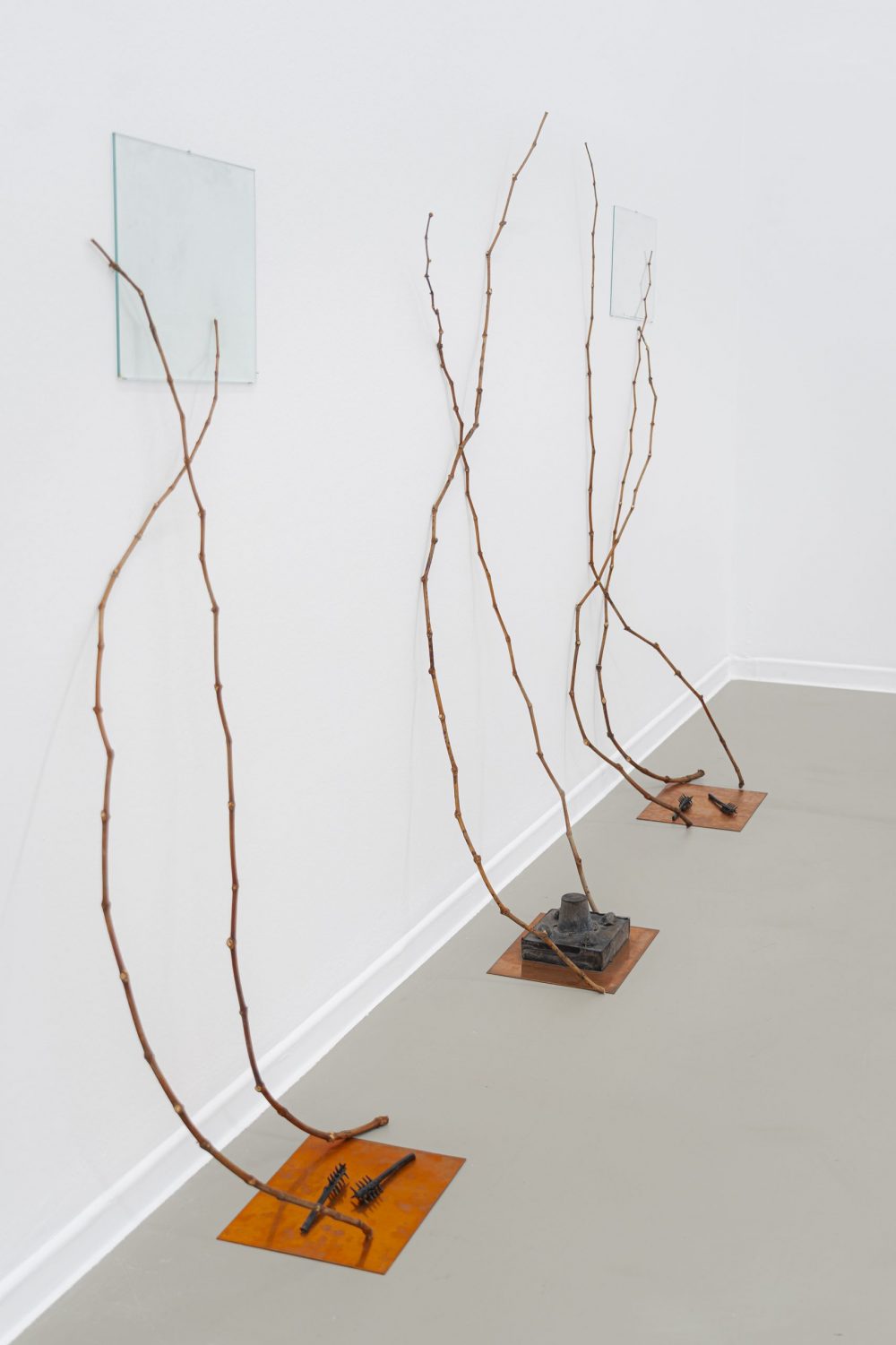Rom ocupa la sala C con un registro más austero, marcado por la recolección de materiales de desecho y elementos naturales. Su práctica, nacida del deambular por paisajes rurales e industriales, se materializa en obras que oscilan entre lo orgánico y lo tecnológico. Crosta (2023), teñida con cúrcuma, adquiere una dimensión epidérmica; mientras que piezas como Vedat o Salutació exploran la maleabilidad del barro y del ladrillo erosionado. La instalación Erm (2024-25), realizada con tallos de esparraguera transformados en espinas, sintetiza su reflexión sobre territorio, precariedad y resistencia. En paralelo, su pieza inédita Jaeggy (2024) introduce un guiño literario y lúdico con flores de hueveras de cartón.