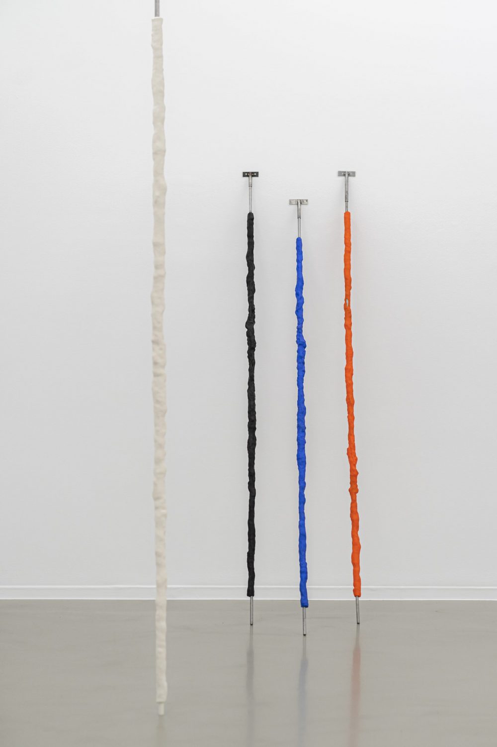 El recorrido se organiza en dos salas contiguas, donde cada artista despliega su propio universo formal. En la sala B, Mendizabal retoma el hierro como eje central, un material con el que ha experimentado desde los ochenta y que reaparece en obras como Melena (1986). Su pieza central, Sur le sol comme le débris (2023), funciona como una instalación a gran escala en la que conviven tubos-umbrales, muros de planchas metálicas y esculturas que combinan impresión 3D, alabastro o plástico. La obra más reciente, Ese quiebro (2025), despliega una vibrante coreografía de líneas de hierro recubiertas de plastilina, impregnadas de color y energía vital.