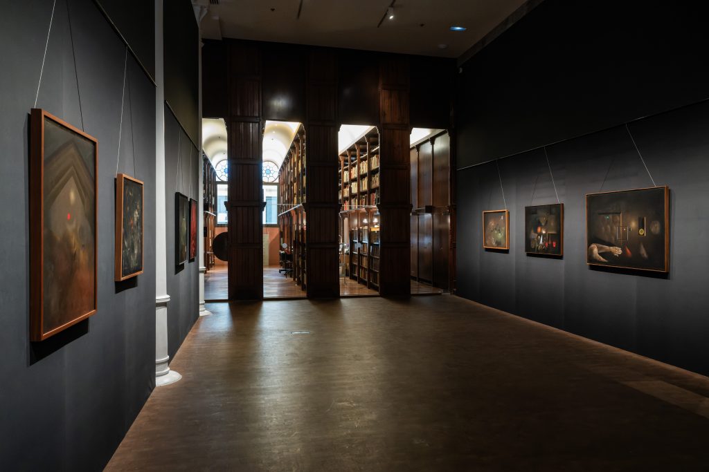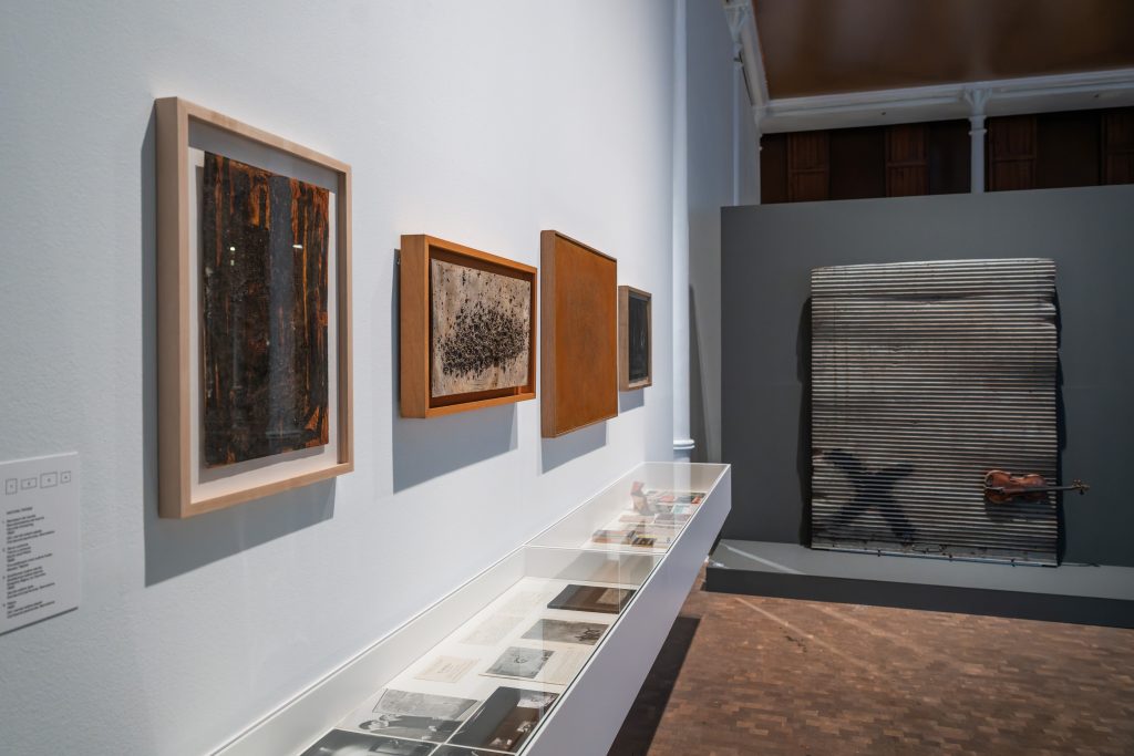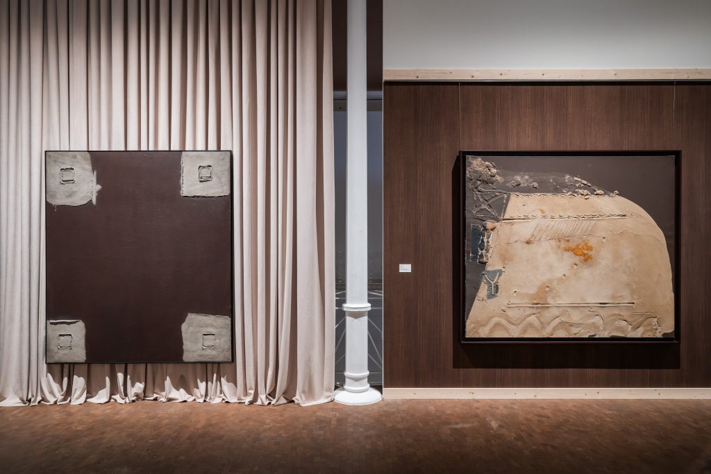 La reconstrucción de los contextos expositivos originales resulta especialmente reveladora. Frente a la neutralidad que caracterizó buena parte de la museografía posterior, las galerías donde Tàpies expuso en los años cincuenta presentaban paredes oscuras, textiles densos, iluminaciones dramáticas o dispositivos de suspensión poco habituales. Esos elementos incidían directamente en la lectura de la obra y favorecían interpretaciones ligadas a lo atmosférico, lo matérico o incluso lo inquietante. La exposición actual permite percibir cómo esos condicionantes influyeron en la consolidación de un estilo que hoy se considera inconfundible.