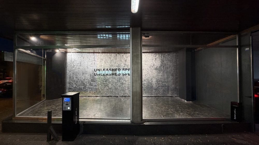 La programación ha continuado observando estas relaciones entre lenguaje y entorno arquitectónico. La instalación actual, Unleashed Speed / Unleashed Speech de Stefan Brüggemann (México, 1975), se inserta en esta línea mediante una composición de elementos textuales, materiales reflectantes y luz artificial. Brüggemann trabaja desde hace años con la idea de cómo los mensajes se generan, se repiten y se consumen en espacios saturados. En Parking 406 aplica pan de plata sobre la pared principal siguiendo un patrón irregular que deja visibles las huellas del proceso. Sobre esa superficie se dispone un vinilo con el texto que da nombre a la pieza y dos neones que repiten las palabras Speed y Speech.